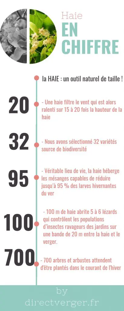 « Brise-vent, une haie protège les parcelles agricoles en diminuant la vitesse du vent de 30 à 50 %. Grâce à cela, l’érosion est moindre, la consommation d’eau diminue. Elle est un outil naturel fort utile. Véritable lieu de vie, la haie abrite de nombreuses espèces animales très utiles pour combattre les nuisibles. »
